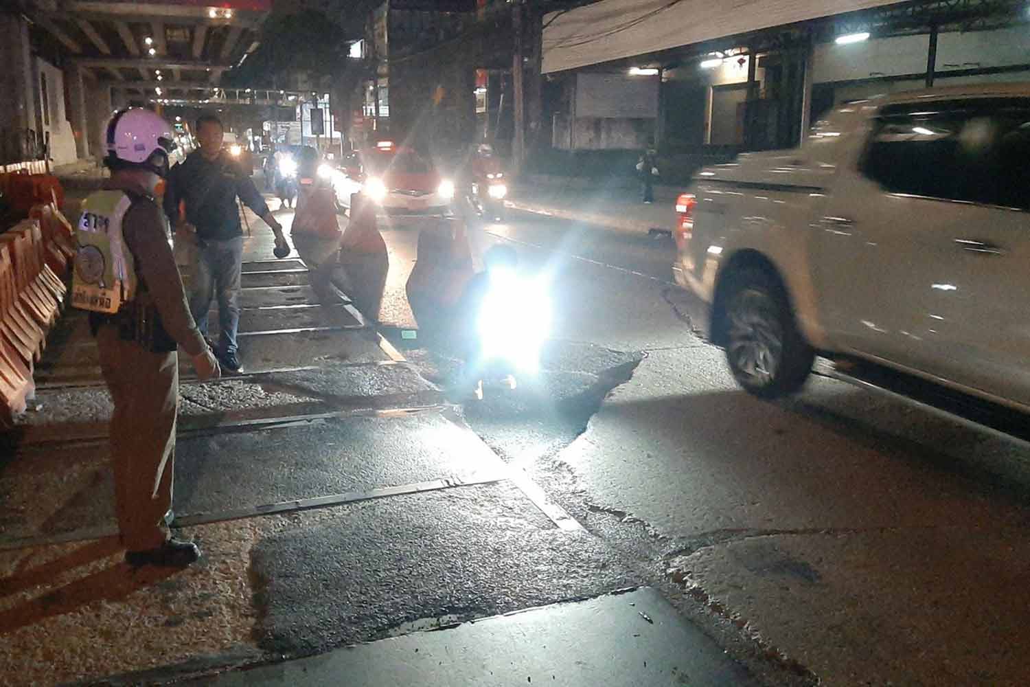 САМУТ ПРАКАН: Сообщалось, что около десятка транспортных средств были повреждены, а мотоциклист ранен, когда они въехали в просадку рядом с временным укрытием на дороге Сринакарин в районе Муанг в понедельник вечером.