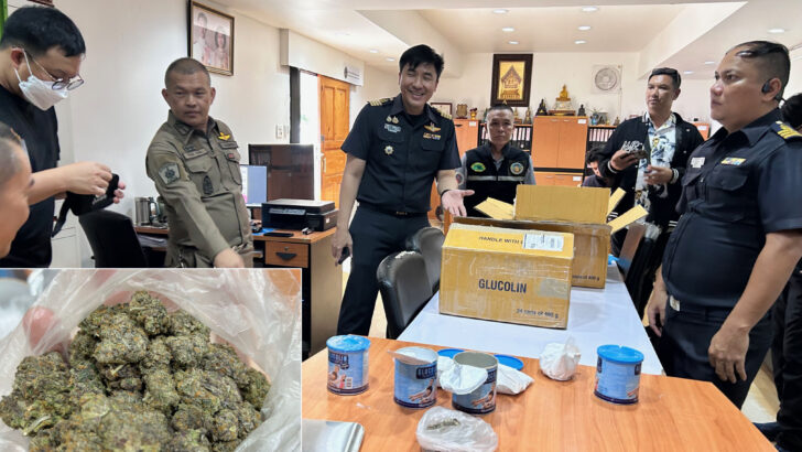 Офицеры таможни и карантина Нонг Кхай проверяют изъятые пакеты, содержащие соцветия каннабиса, которые пытались контрабандой провезти в Лаос, 30 июня 2025 года.
