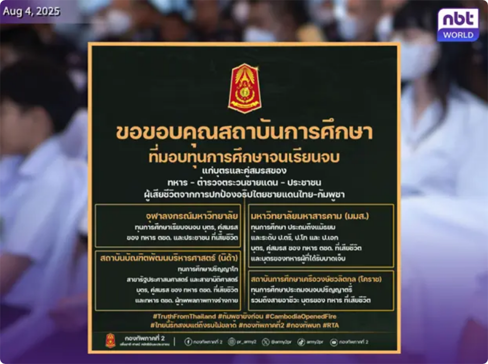 БANGKOK, Таиланд – 2-й армейский регион выразил благодарность тайским учебным заведениям, которые предлагают стипендии для поддержки детей и супругов солдат, пограничной патрульной полиции и гражданских лиц, потерявших жизнь, защищая тайский суверенитет вдоль тайско-камбоджийской границы. Эти стипендии помогают снизить долгосрочную образовательную нагрузку на пострадавшие семьи и помогают […]