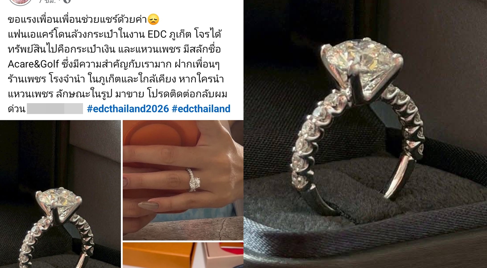 Пхукет — Мужчина, который планировал сделать предложение своей девушке на музыкальном фестивале EDC Thailand 2026 в Пхукете, обратился за помощью после того, как во время события были украдены бриллиантовое кольцо и кошелек. 18 января 2026 года пользователь Facebook, идентифицированный как Acare Alice, опубликовал обращение в социальных сетях, поделившись тремя фото […]