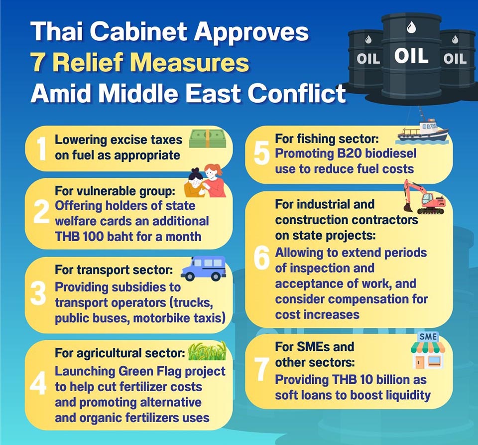 БАНГКОК, Таиланд – Кабинет министров на своем специальном заседании 26 марта 2026 года под председательством премьер-министра Анутина Чарнивиракула одобрил семь мер, направленных на помощь людям, особенно представителям уязвимых групп, справиться с последствиями ситуации на Ближнем Востоке, включая: Снижение акцизных налогов на топливо по мере необходимости; Предложение дополнительной суммы в 100 бат (USD […]